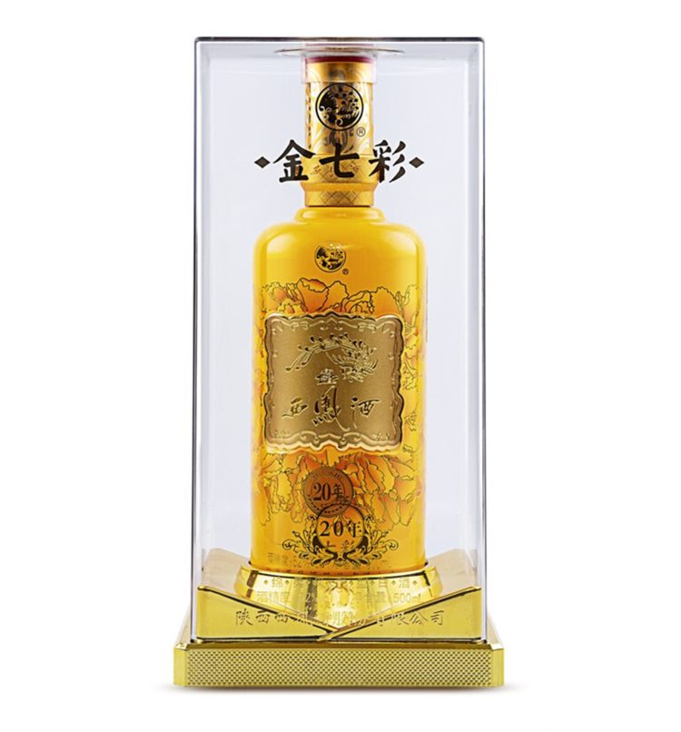 金七彩20年,高级质感透明亚克力材质外盒,其瓶身通体金黄,搭配烫金品牌标志印花,有种近似黄金的闪耀、华贵。瓶体环绕朵朵盛放国花牡丹,栩栩如生,彰显了一种蓬勃向上的生命力。选用20年酒海陈酿作为基酒勾调,经典陈年凤香。品金七彩,象征一种光明、积极的人生态度。
